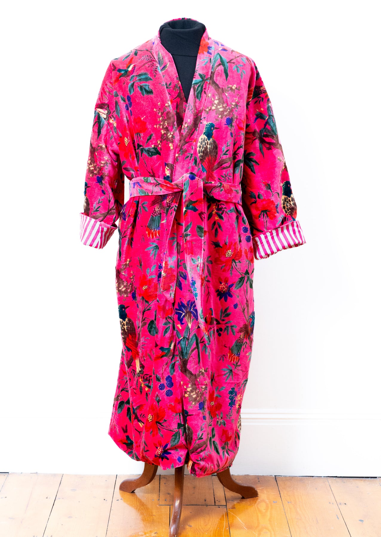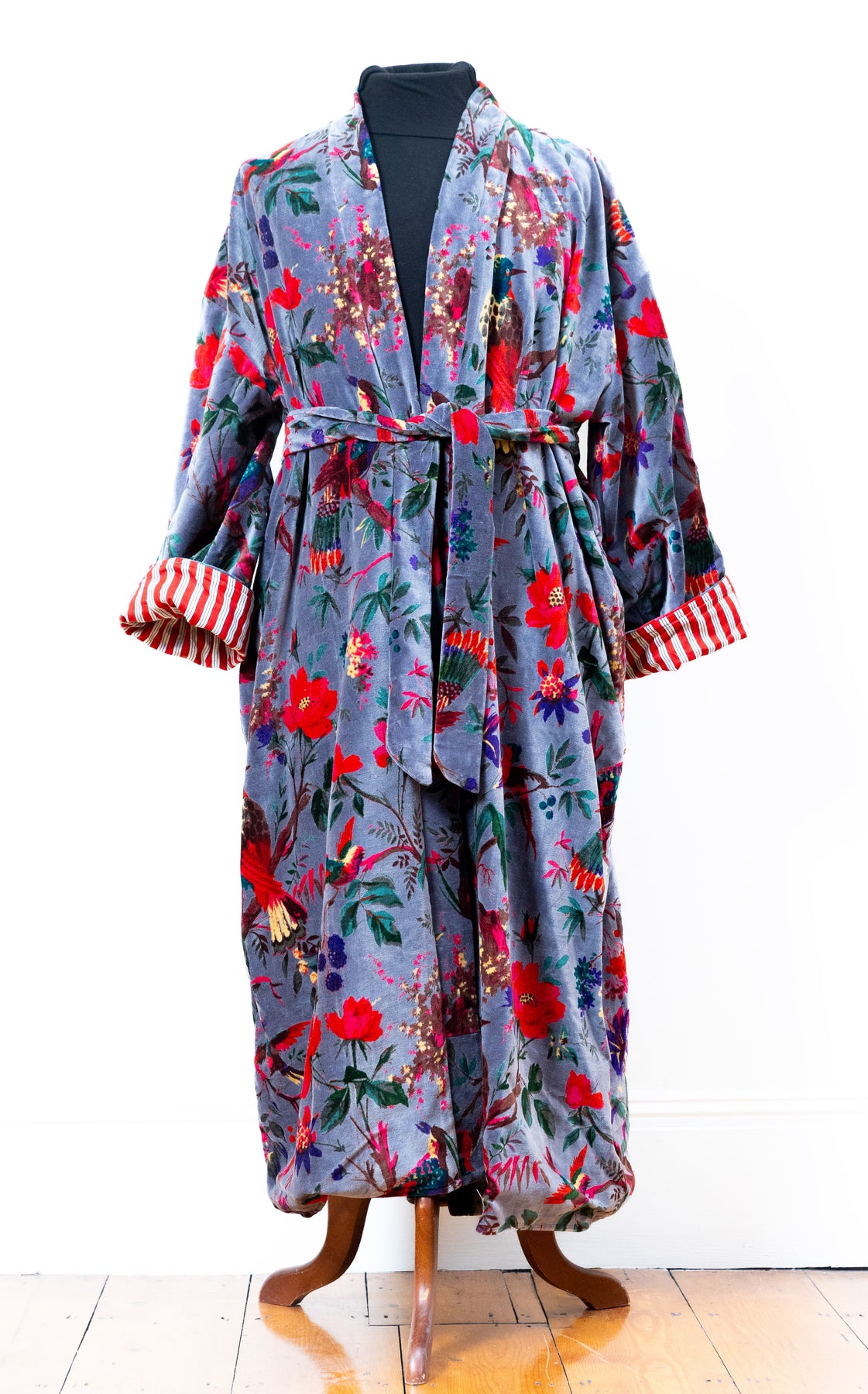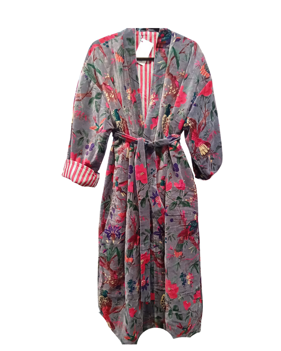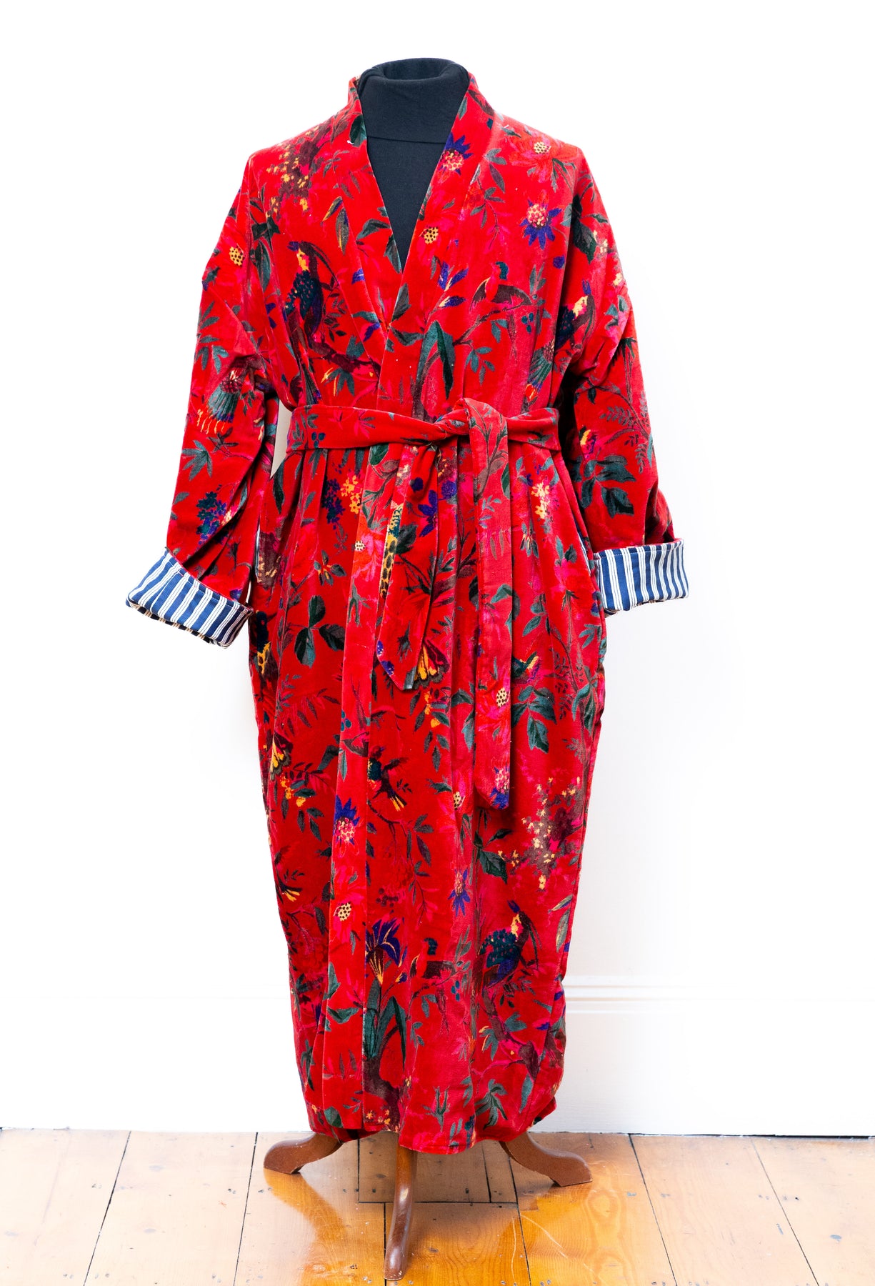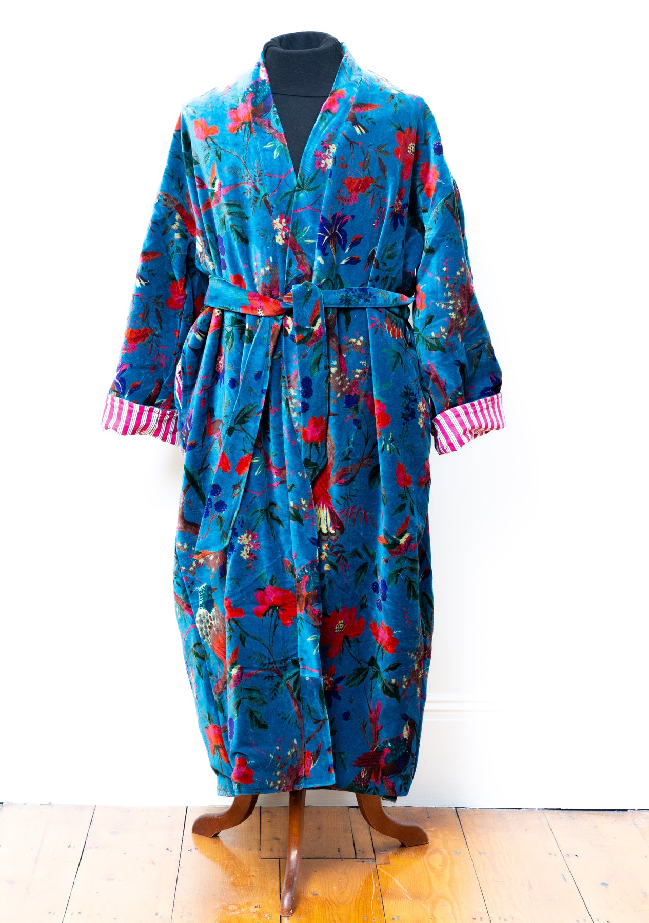 Wrap yourself in vibrant hues with our velvet kimono-style dressing gown. Velvet exterior, lined with cotton. Perfect for gifting or adding a pop of colour to your night-time routine. Waist tie, and 2 loops. One size fits almost all!